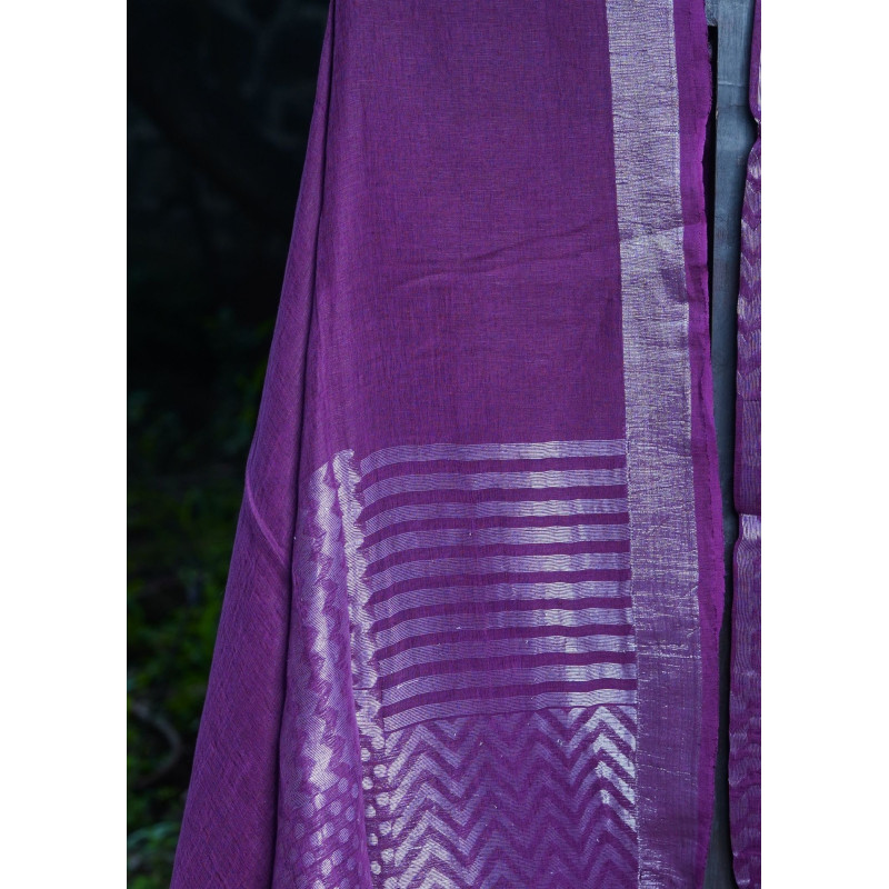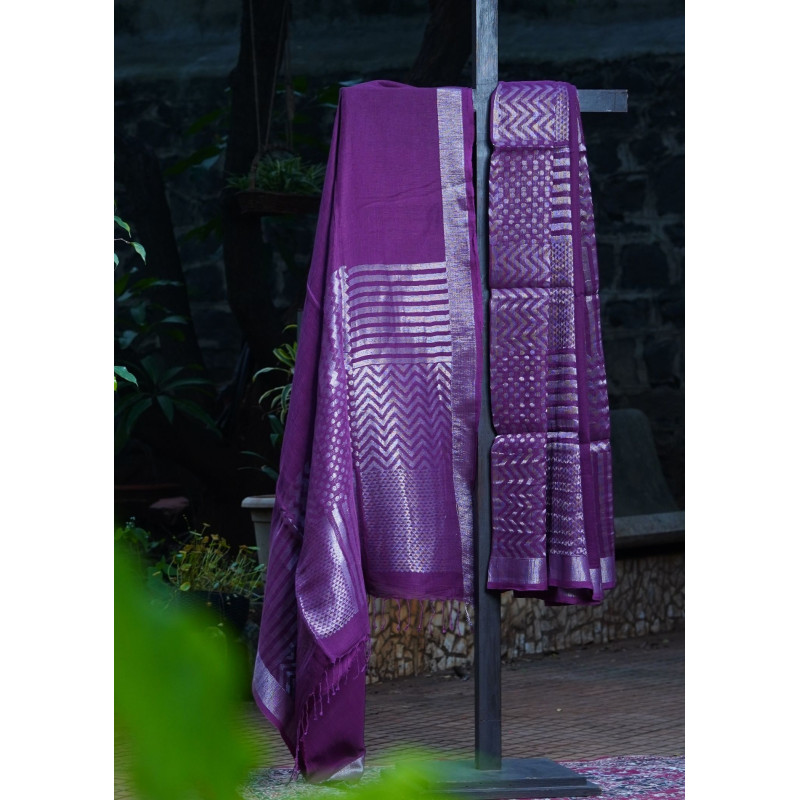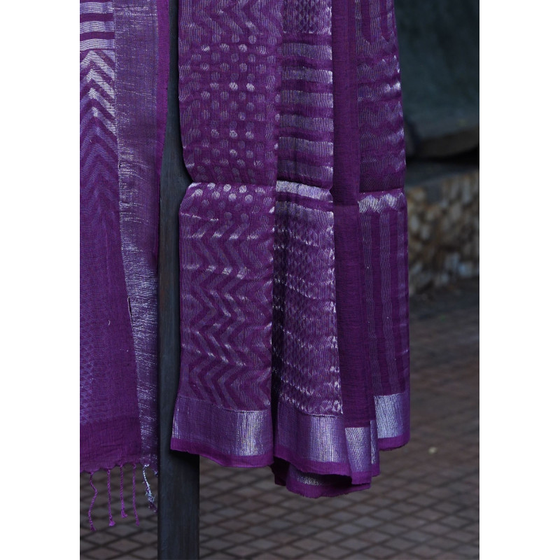 Rich purple linen meets the rustic charm of khadi in this stunning handspun creation that we couldn't help but fall in love with at first sight. The earthy texture of khadi provides the perfect canvas for exquisite silver work that catches light beautifully, creating an elegant contrast against the deep purple backdrop. Each silver thread is meticulous placed by skilled artisans, transforming this humble handwoven fabric into something truly regal. The breathable linen-khadi blend offers unmatched comfort while the metallic accents add just the right touch of glamour to this unique piece.