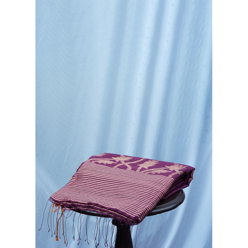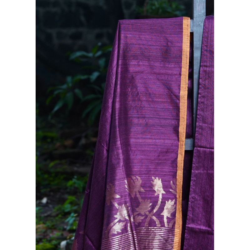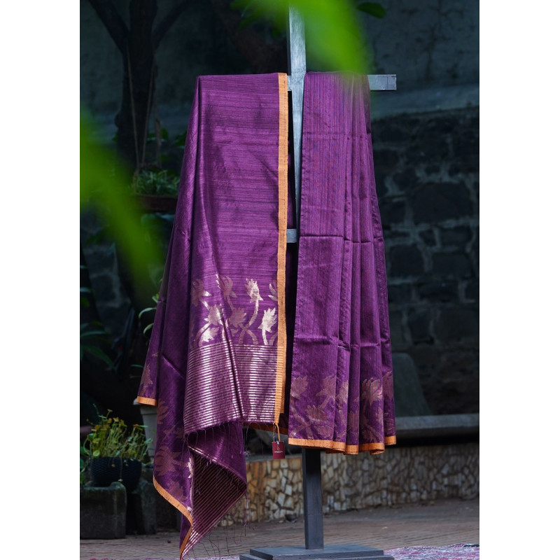Experience regal sophistication with this stunning plum matka silk saree adorned with golden threadwork. Delicate floral motifs dance across the rich purple canvas, while the contrasting golden trim adds a touch of opulence. The natural texture of matka silk provides an elegant drape that flatters every silhouette.