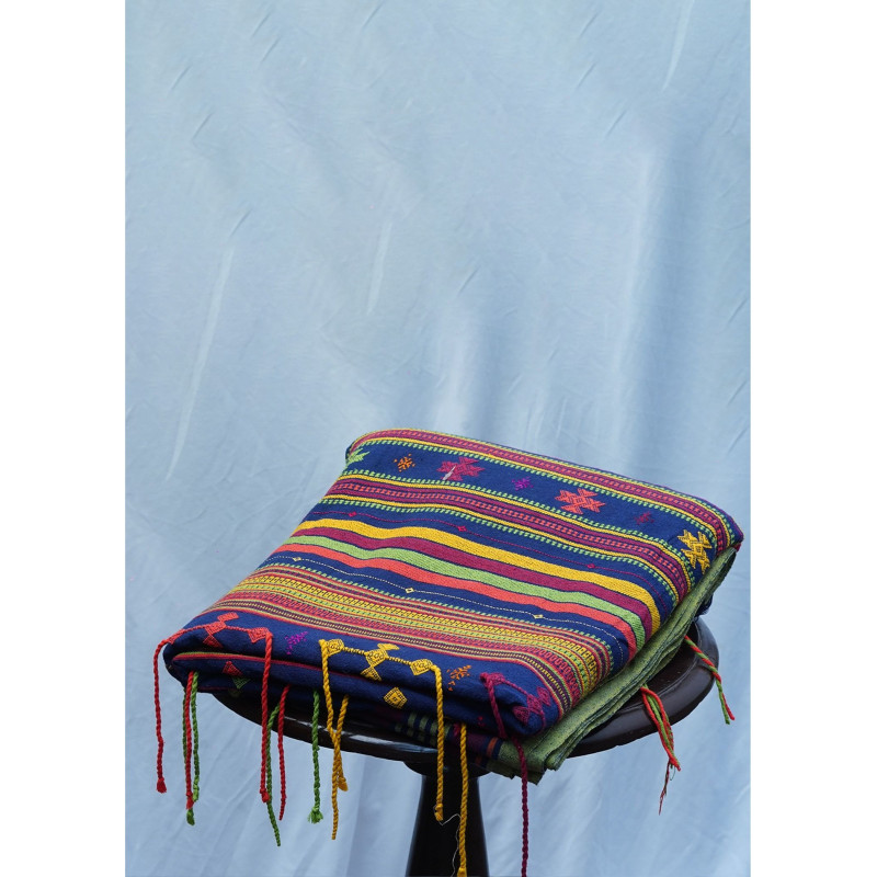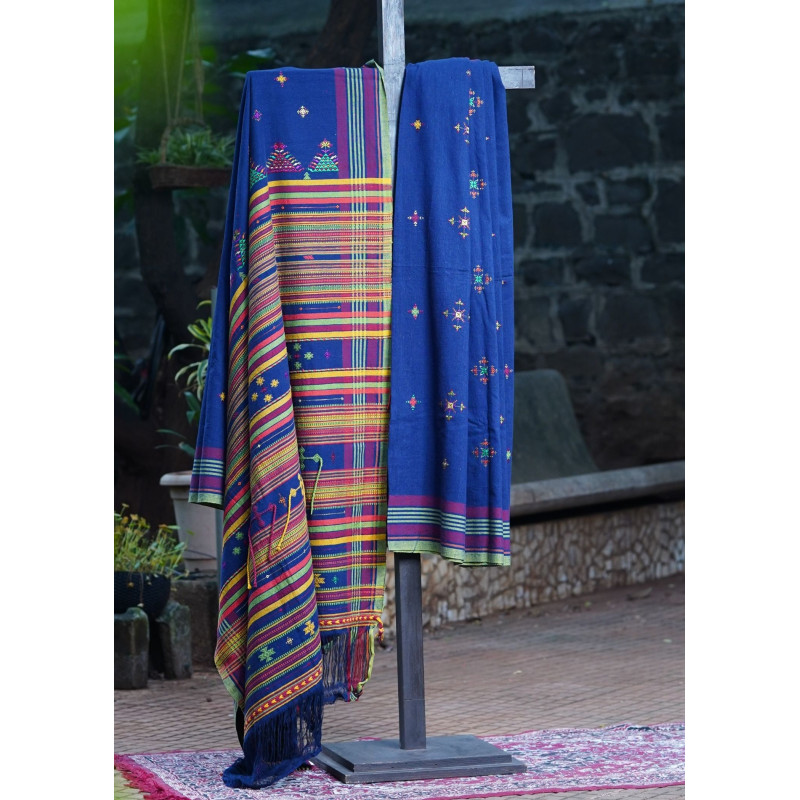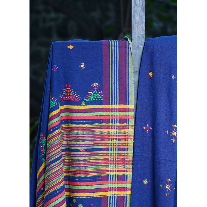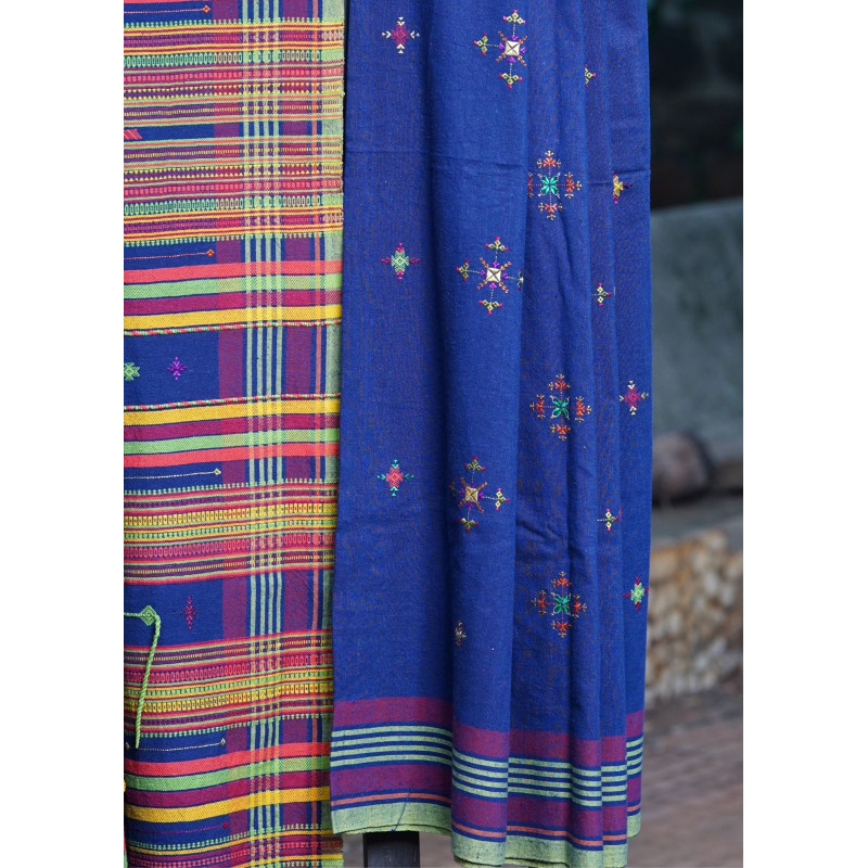 Immerse yourself in the exquisite artistry of traditional Soof embroidery on this magnificent royal blue cotton saree. The intricate needlework features vibrant geometric patterns, floral motifs, and traditional Kutchi designs that showcase hours of meticulous handcraft. Multicolored embroidery threads create a stunning contrast against the rich blue base, while the pallu displays elaborate Soof work that represents generations of textile heritage.