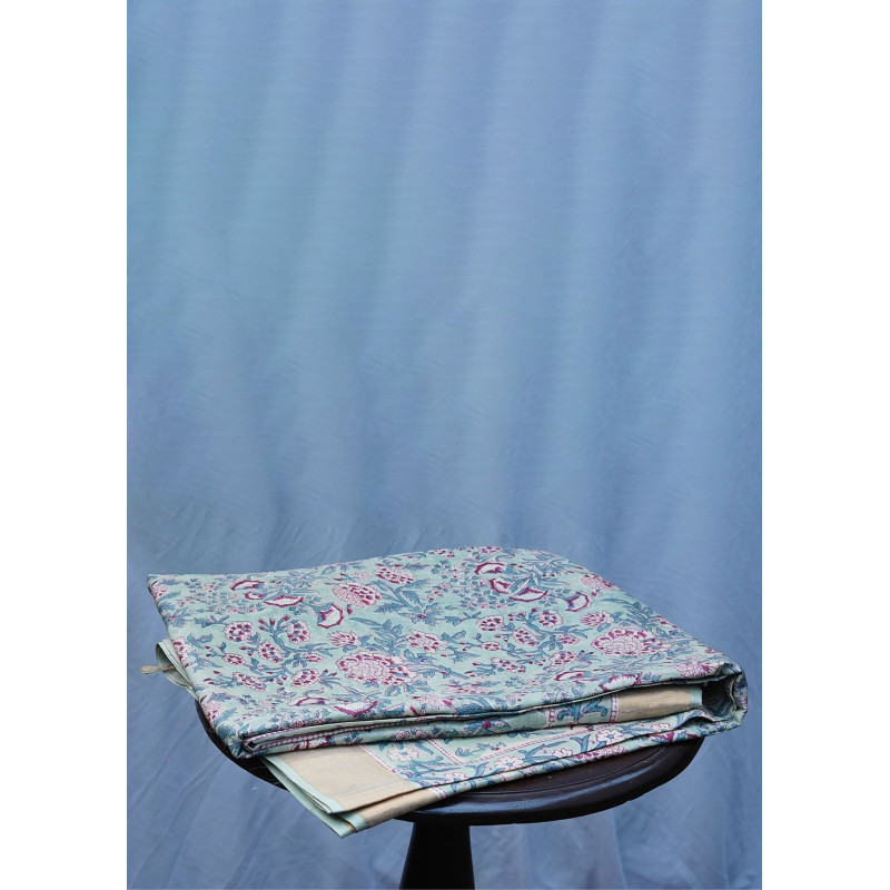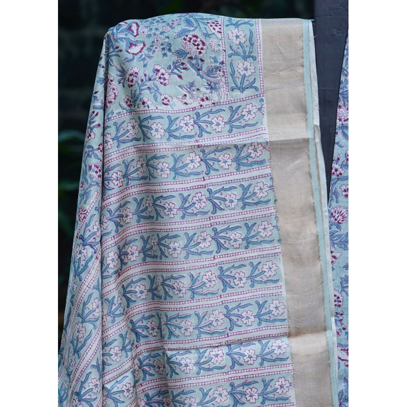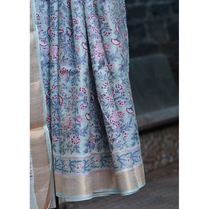 Immerse yourself in the beauty of traditional block prints with this exquisite Tussar silk saree in serene blue and white. The repeating floral motifs showcase centuries-old printing techniques, creating a timeless piece that honors India's textile legacy.