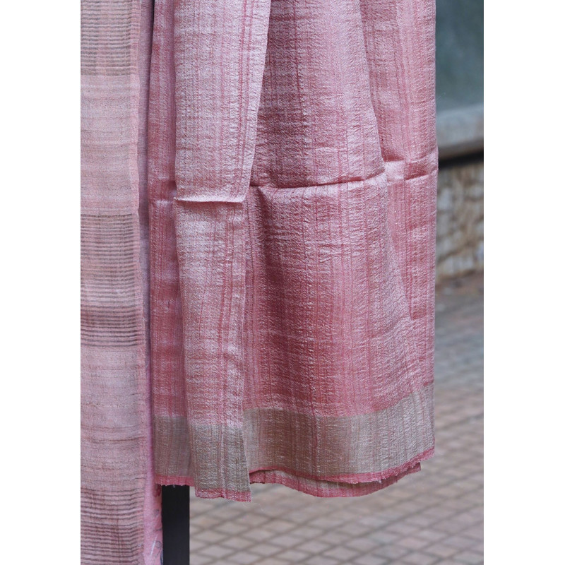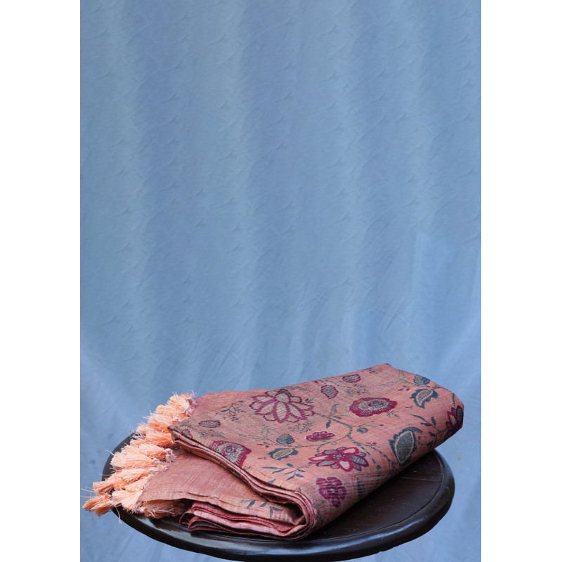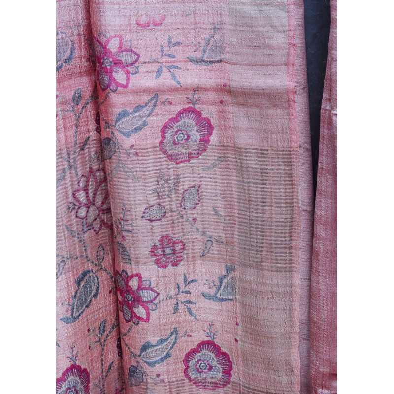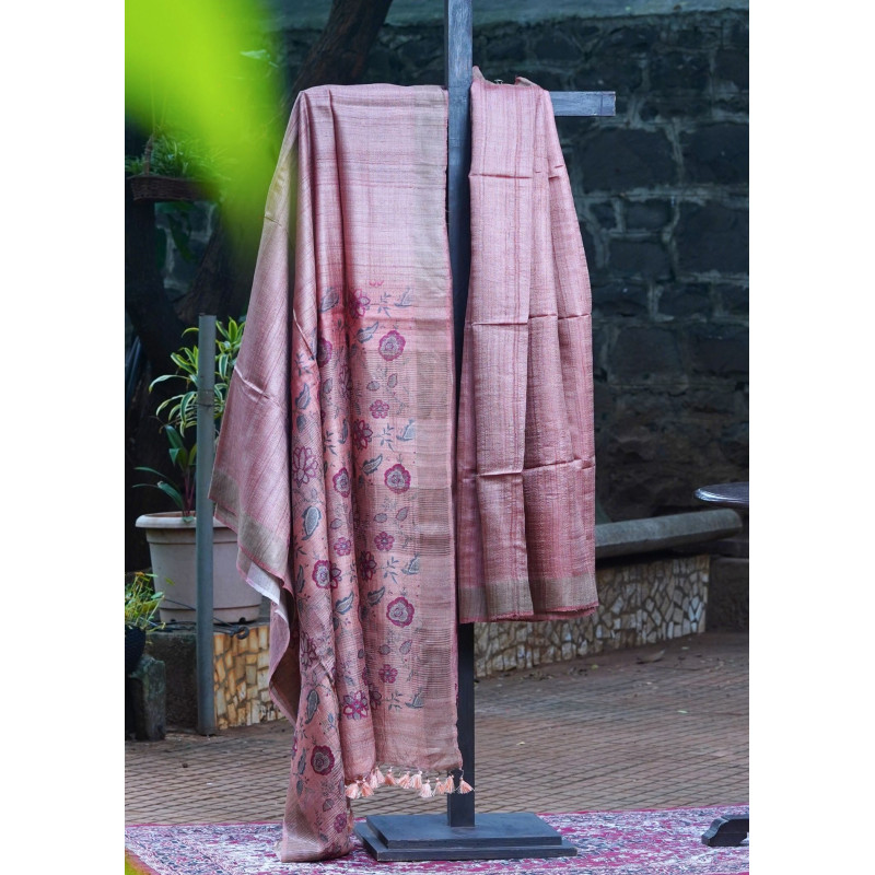 Immerse yourself in the beauty of traditional block prints with this exquisite Tussar silk saree. Presented in a serene blue and white palette, the repeating floral motifs showcase centuries-old printing techniques. The elegant golden zari border adds a touch of classic sophistication, creating a timeless piece that honors India's rich textile legacy.
