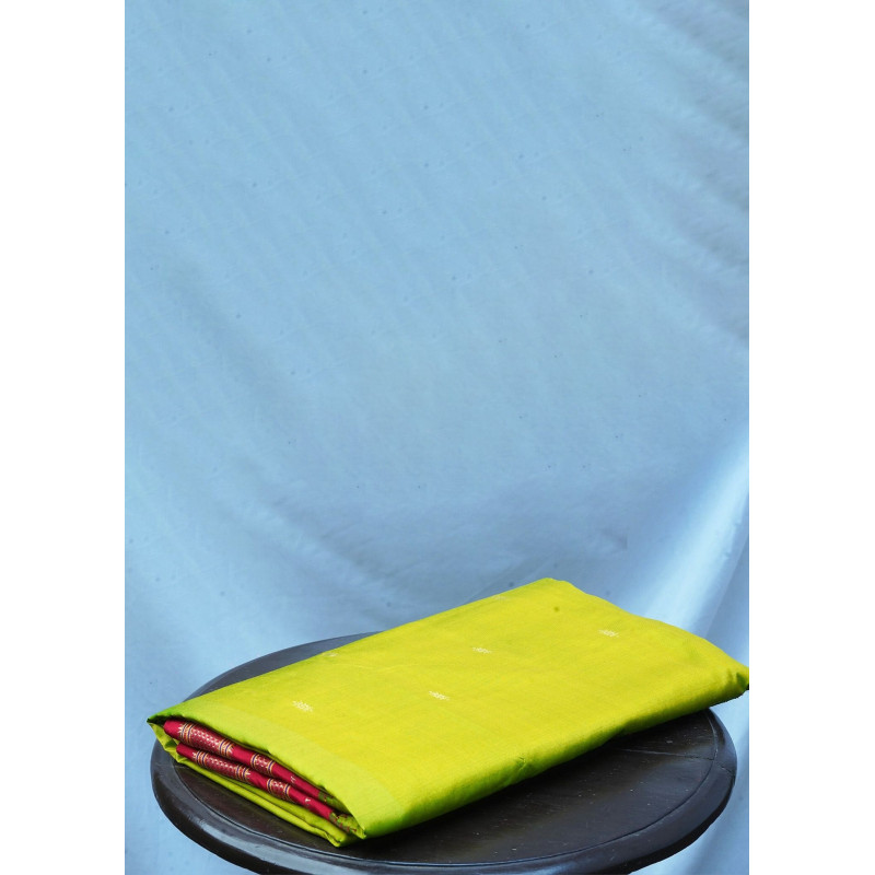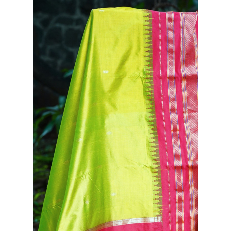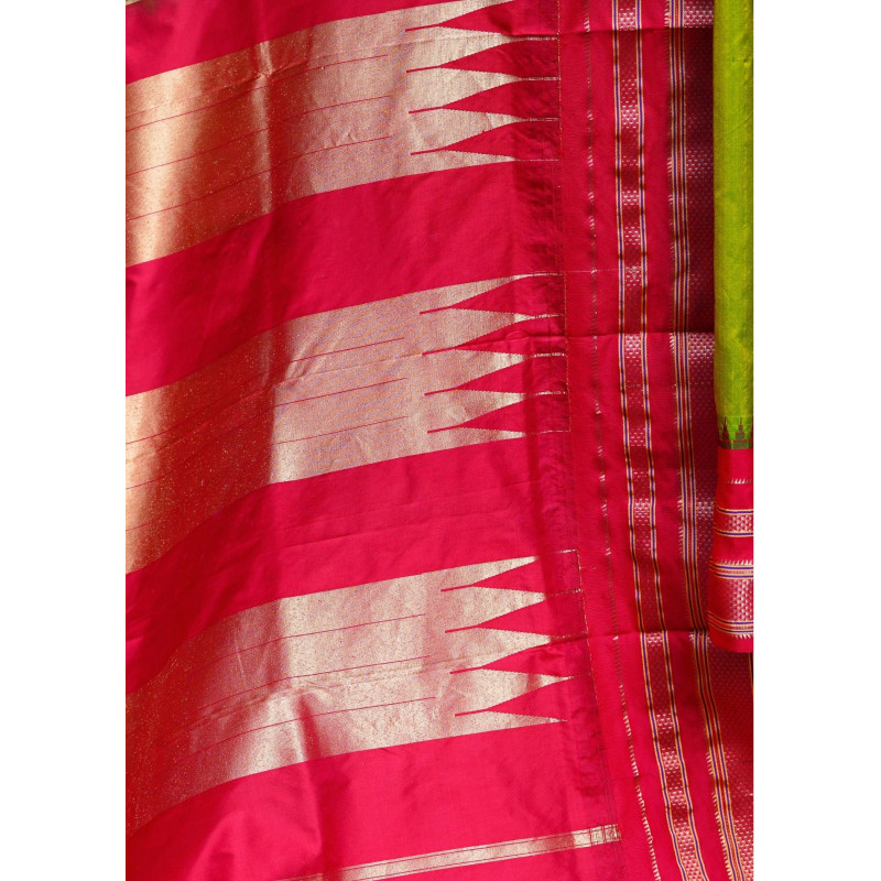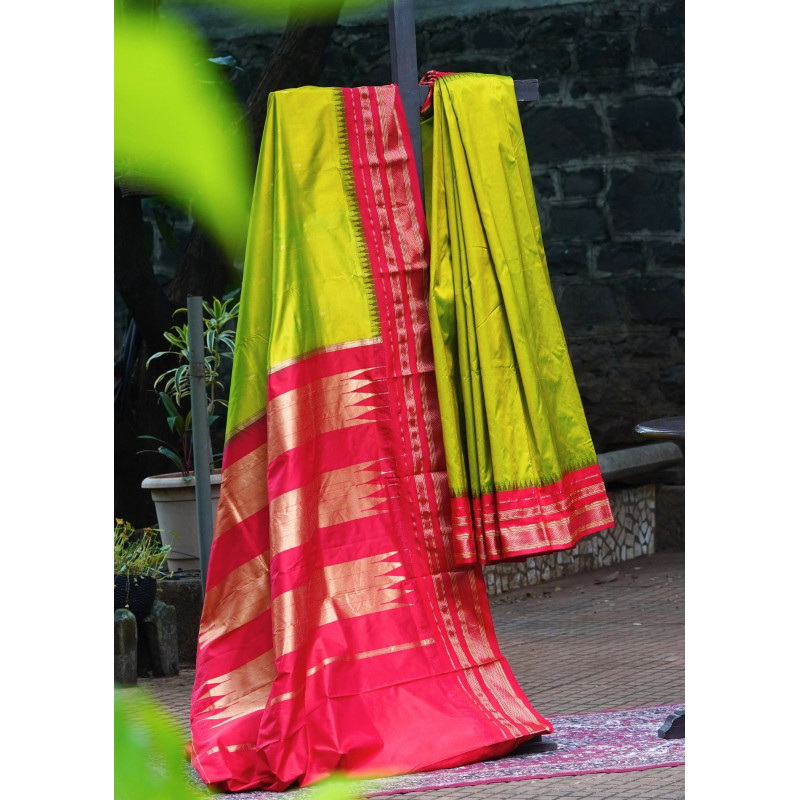Embrace tradition with this vibrant Ilkal silk saree. The striking combination of a parrot green body and a deep rani pink border with temple motifs makes a bold statement. The lustrous silk and rich golden zari pallu are characteristic of authentic Ilkal craftsmanship, perfect for festive occasions.