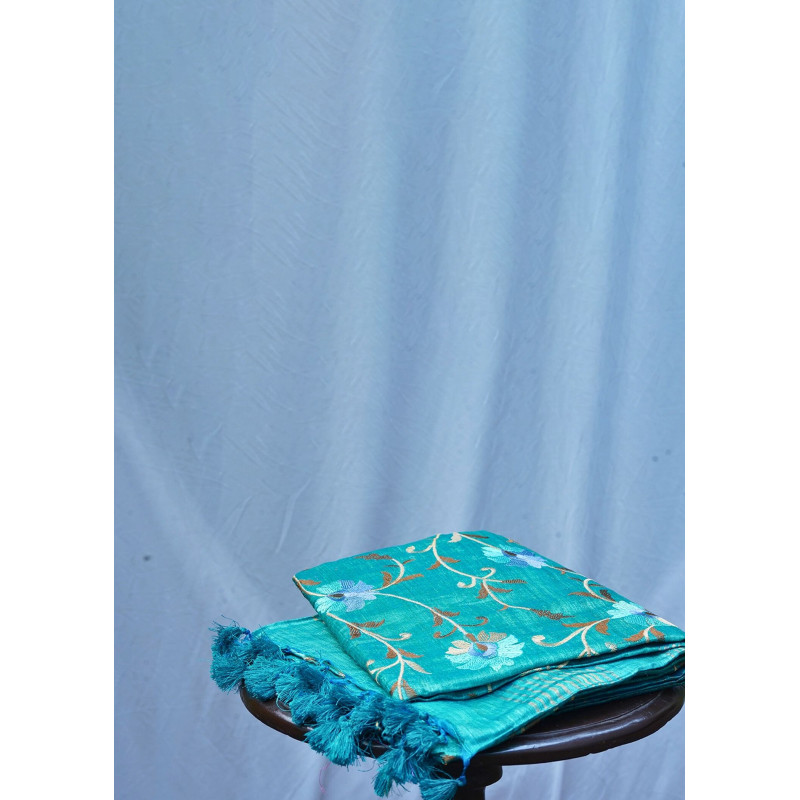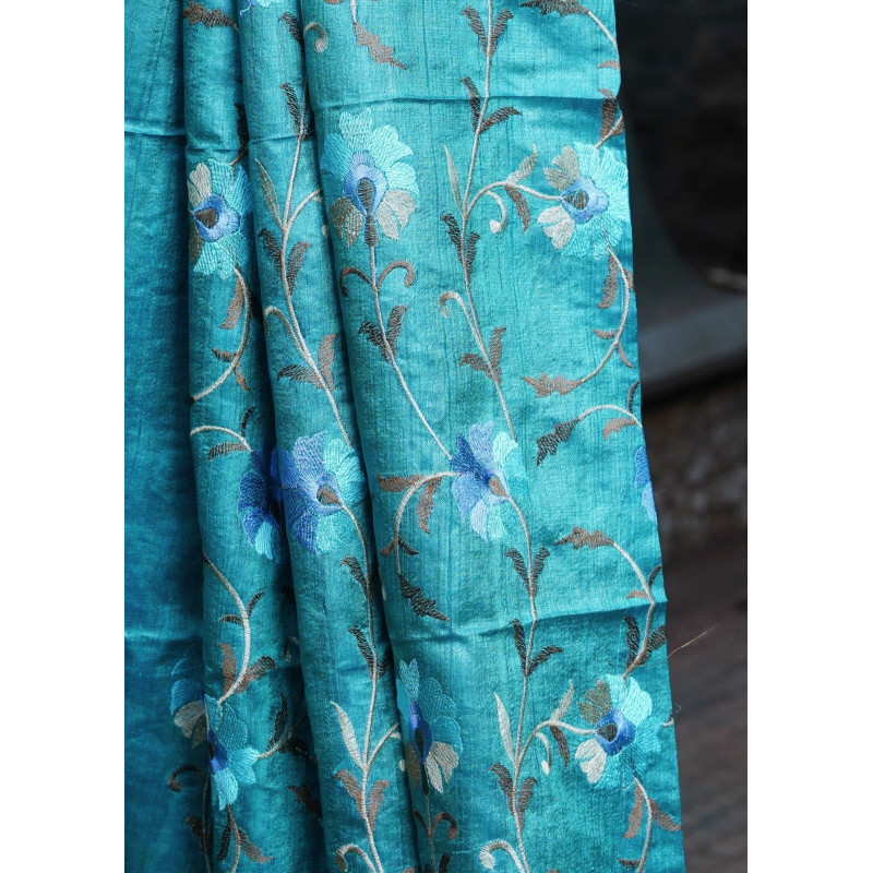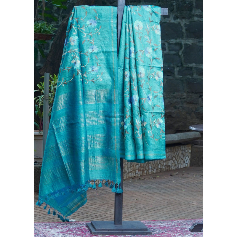 Drape yourself in the deep, enchanting hue of this teal Tussar silk saree. Graceful floral vines meander across the body, leading to a pallu with shimmering horizontal stripes. The rich color and delicate design make it an elegant choice for evening events.