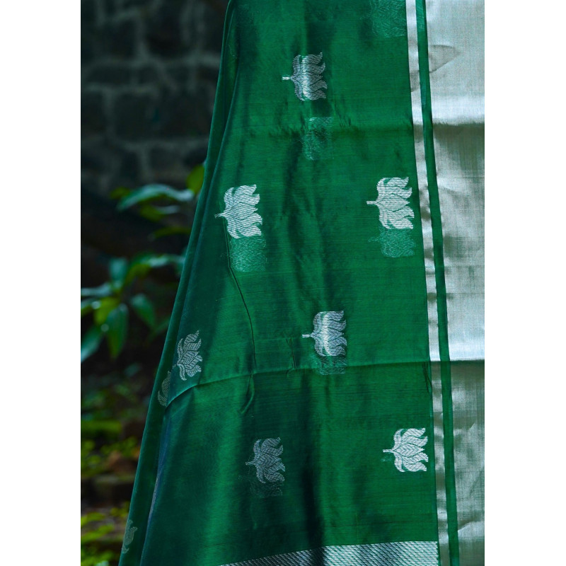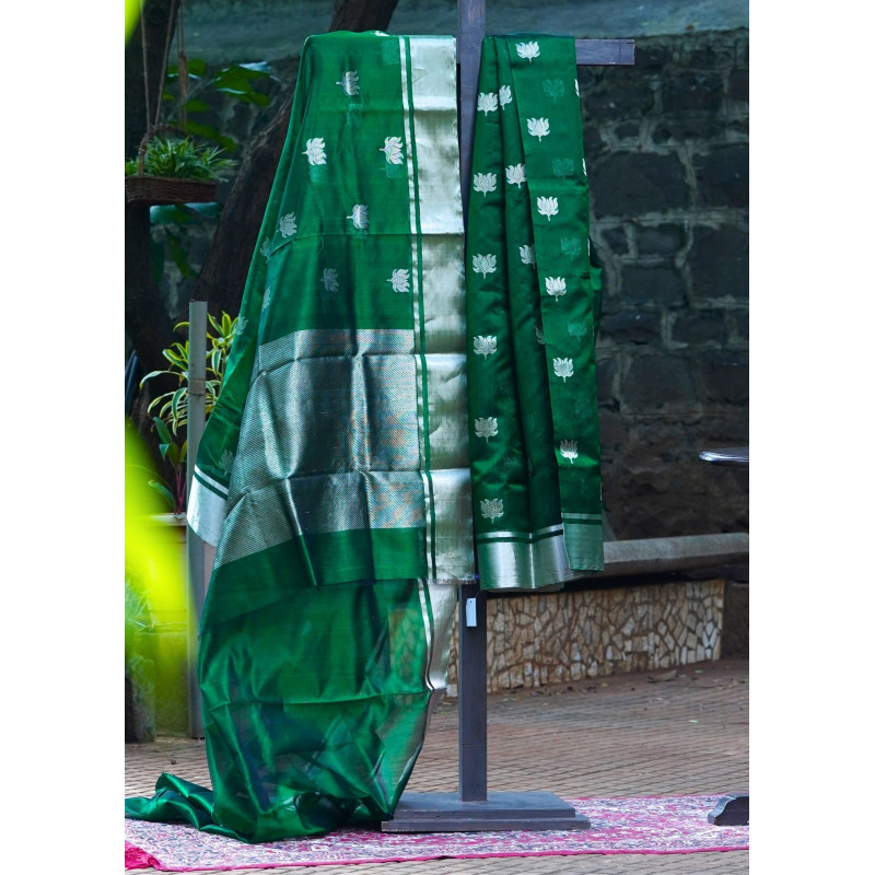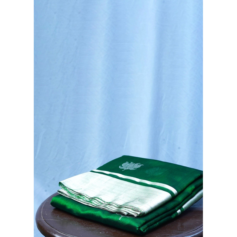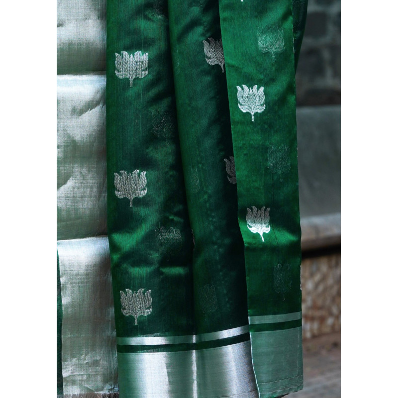 Exuding regal charm, this Pattu silk saree comes in a majestic emerald green. The body is adorned with finely woven silver lotus buttas, beautifully complemented by a wide, lustrous silver zari border and pallu. This is a timeless classic for grand celebrations.