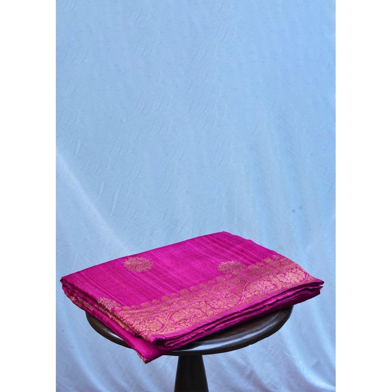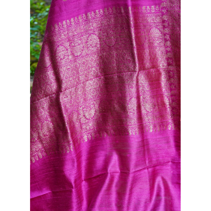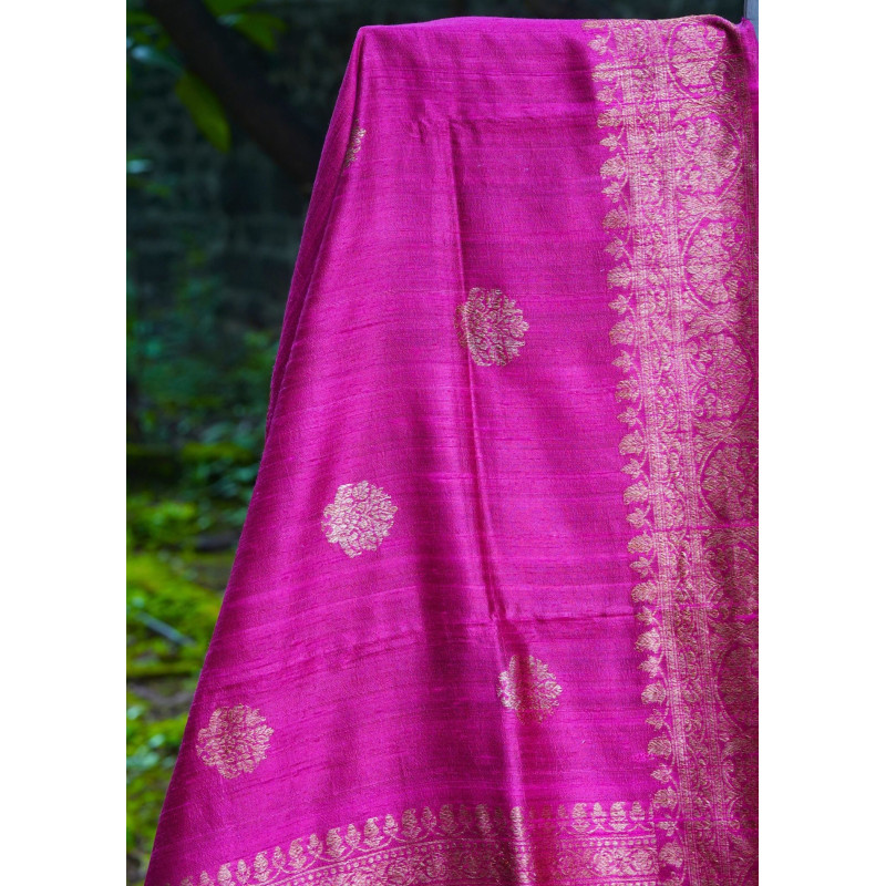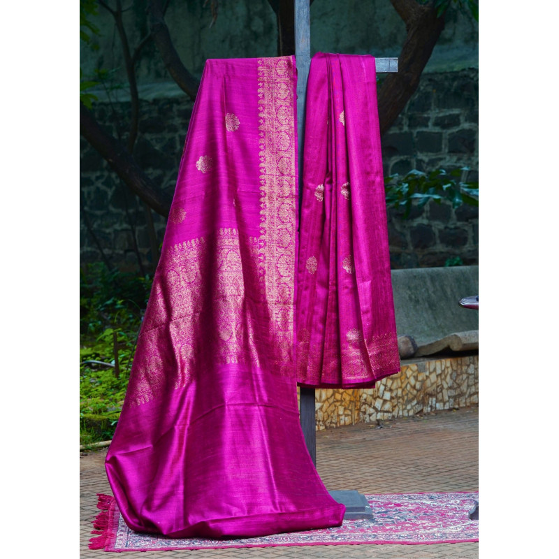 A celebration of texture and tradition. This saree combines the rich, rustic texture of Tussar silk with the opulent gold zari weaving of Banaras. The vibrant rani pink hue and the densely woven pallu make this a breathtaking choice for a bride or for any grand occasion.