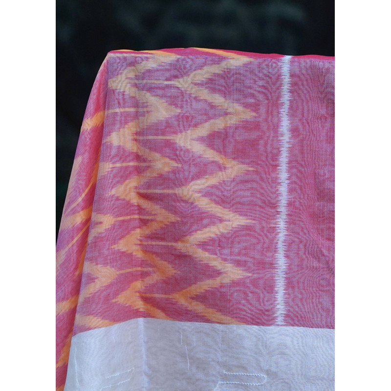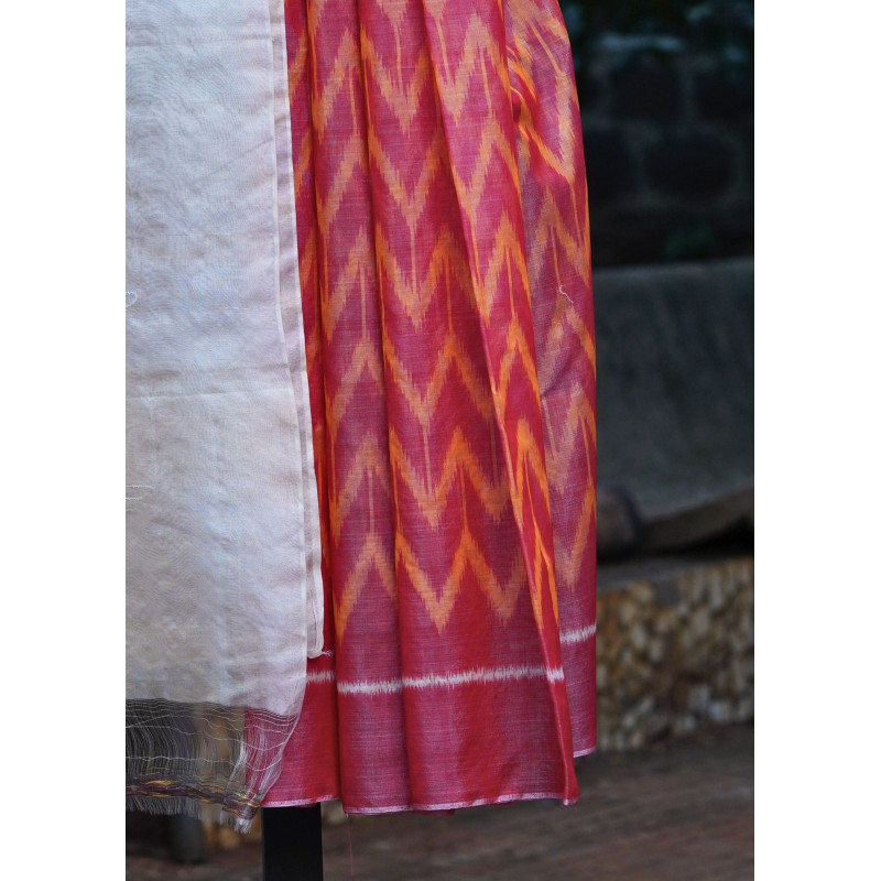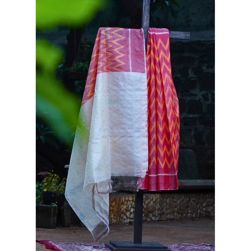Step into timeless elegance with this exquisite Tussar silk saree adorned with striking crimson ikat patterns. The bold interplay of ivory and red hues creates a powerful statement, while the natural texture of Tussar silk adds richness and sophistication. Ideal for festive occasions, cultural gatherings, or when you wish to blend tradition with a bold contemporary edge.